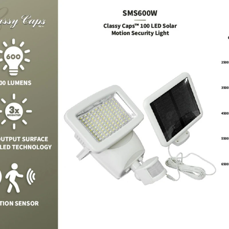 Classy Caps 100 LED’s super bright Solar Motion Sensored Security light is sure to effectively illuminate any outdoor area such as your home, business, driveway, parking lot, loading dock and entrance way. With its 180 degree motion sensor detection range up to 10 meter (30 ft) detection distance this powerful 800 Lumen bright white solar motion sensored secuirty light is adjustable and will stay on for a time range of 10 seconds to 2 minutes. The solar panel can be mounted up to 4.5 meters away from the light fixture. Installs easily with included wall mount and hardware.