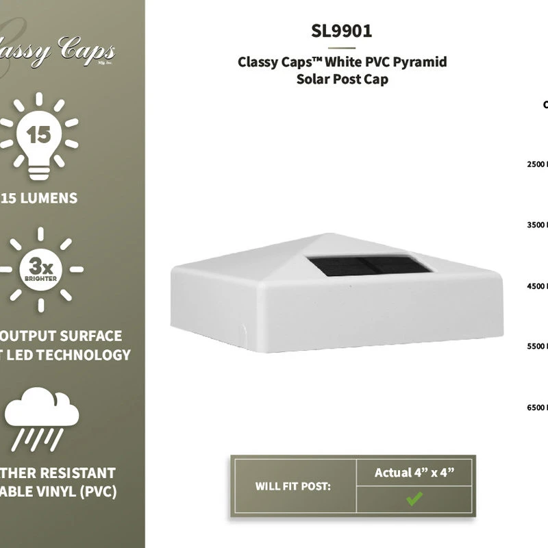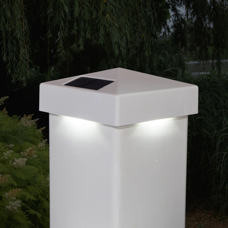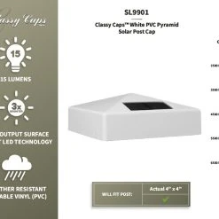 Similar in design to our low profile Cambridge solar post cap, the Oxford is manufactured from heavy duty, weather resistant cast aluminum with a durable powder coat satin finish that is offered in three colors. Featuring unique decorative glass lens and two surface mount LED s, the 6×6 Oxford Solar Post Cap will cast a warm natural light that will automatically light up at dusk creating a picturesque landscape for your fence, porch or deck. Another superior design by Classy Caps. Adaptor included to fit over 3 post sizes -an actual 6 x6 , 5.5 x5.5 or 5 x5 post.