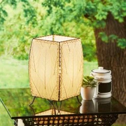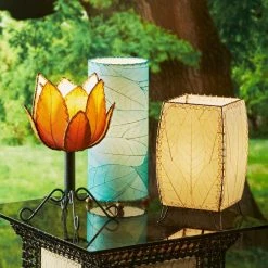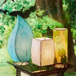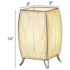 The Outdoor Indoor Cube Lamp highlights gentle, sloping curves at its corners along with a striking display of cocoa leaves on its four panels. With an antique copper finished frame this lamp creates functional upward light while maintaining a sense of charm and intrigue. It s a simple shape makes it ideal of almost any style or setting.