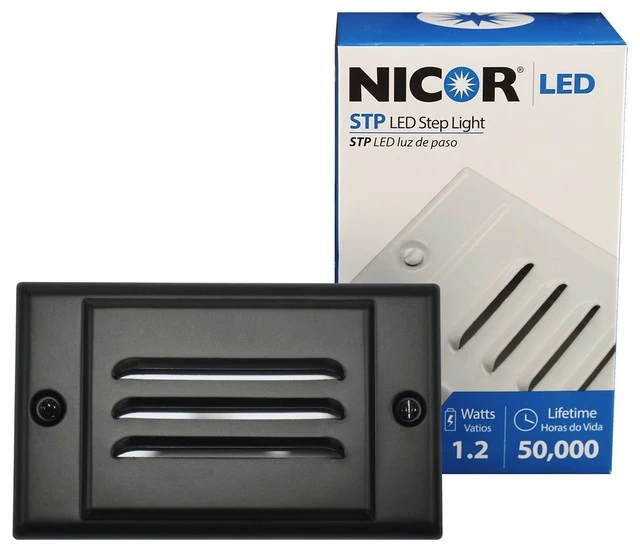 NICOR STP-10-120-HBK LED Step Light with Black Horizontal FaceplateNICOR’s LED Step Lights are a great complement for your residential and commercial projects. This step light not only provides a touch of safety, but it offers a warm, natural glow making it a perfect accent for any project. The LED Step Light offers energy savings (using only 1.2 Watts) over the life-span calculated at over 50,000 hours. This Step Light is sealed and approved for use in wet locations, making it ideal for outdoor use on decks, porches, and pathways. It’s also ideal to use indoors to light up hallways, stairways, or as a simple night light. The LED Step lights are available in White, Black, Nickel, and Oil-Rubbed Bronze Faceplates in either Vertical or Horizontal orientations. If you need a specific color, the White faceplates are also paintable. The Step Light features a warm 2700K color temperature. Protected by NICOR’s 5 year limited warranty.Size: 4.5″Color: BlackFinish: Powder CoatPrimary Piece Material: ABSSecondary Piece Material: Stamped AluminumDimension(in): 4.6(L) x 2.75(W) x 2(Depth)Bulb: 1W LED, 19 Lumen Actual, 2700K, Not Dimmable(Included)Recommended Bulb Type: LEDAdapter/Bulb Base: HardwireCertification: UL/cUL, FCCLocation Rated: WetWarranty: 5 YearsIncludes an LED Module and a Black Horizontal Oriented FaceplateModular design allows fixture to be mounted in horizontal or vertical orientationConstructed with die-stamped aluminum and powder-coated faceplates.The Louvered faceplate design conceals LED’s from direct line of sight while maximizing wide light distributionThe High Efficiency LED Step Light is maintenance-free and fully sealed to keep out water, dust, and the other elements.The performance grade LED’s and electrical driver provides optimal light output while using only 1.2 Watts of energy.TM-21 Projected L70(6k) life 50,000 hoursUses standard household Input voltage of 120VOperating temperature rating of -10F to 122F (-23C to 50C)Protected by NICOR’s 5 year limited warranty