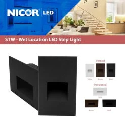 NICOR’s STW Series LED Step Lights are the perfect accent lights for hallways, stairways, porches, patios, and outdoor walkways. The LED step lights are available in both vertical and horizontal orientations to fit your space correctly. The sealed wet location rated step lights are perfect for outdoor accent lighting to provide increased safety in dark areas. The louvered design produces soft ambient lighting pointed downwards. The slim profile design allows for easy surface mount installation, using standard line voltage hardwiring. The STW LED step light features a 3000K color temperature and is available in Matte Black, Bronze, and White finishes. All LED fixtures are protected by NICOR’s 5-year limited warranty.