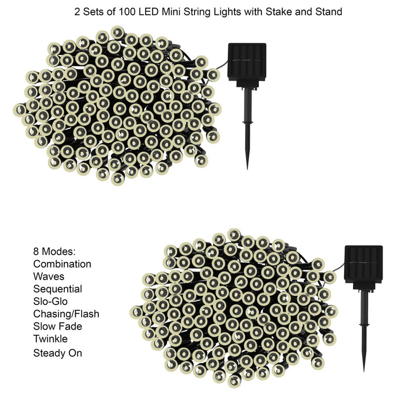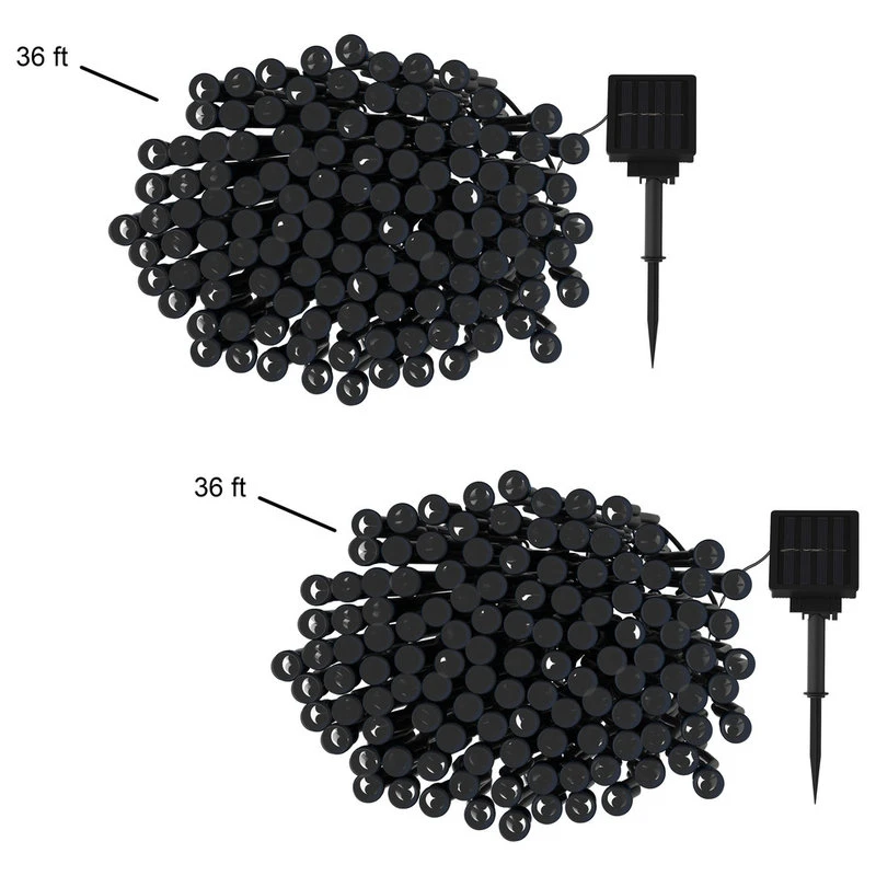 PRODUCT DETAILS- Two Light Strand: 36 feet long with 100 LEDs each. Materials: Plastic. Light Color: Warm White. Solar Panel: 2V/200mA (Included). Rechargeable Battery: AA 1.2 V 1000mAh Ni-MH (Included).