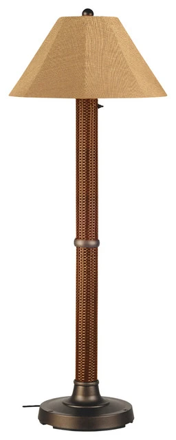 All weather PVC wicker woven base adds dramatic appeal to this outdoor lamp. Bahama Weave 60″ Floor Lamp 26163 with 3″ red castagno wicker body, bronze base and straw linen Sunbrella shade fabric. 12 ft. weatherproof cord and plug. Two level dimming switch.Bulb not included