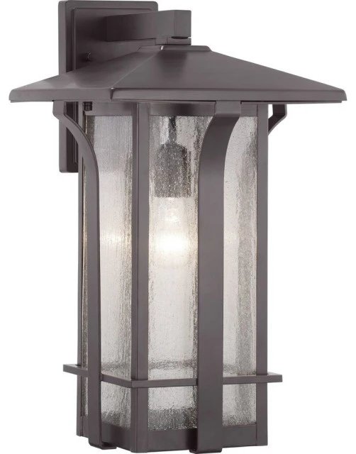 The Cullman Collection outdoor large wall lantern delivers dramatic scale with Craftsman appeal. Bold and linear details in an Antique Bronze finish highlight clear seeded glass. Ideal for spacious Modern architecture settings.
