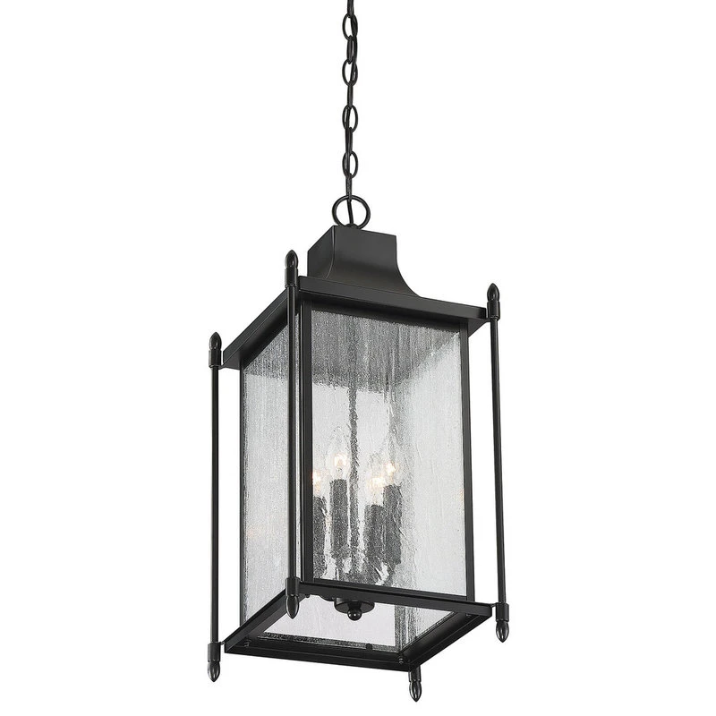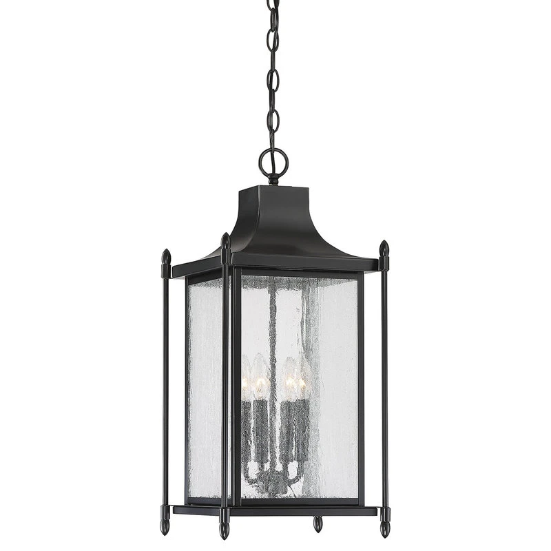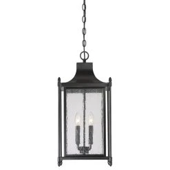 Featuring a design that is classic Americana, this light fixture adds timeless elegance to the outdoor areas of your home. A high quality matte black finish blends incredibly well with many other hardware types and architectural materials. The lantern suits transitional, modern farmhouse, contemporary, and many other decor styles, too. A traditional box shape is enhanced with slim outer columns, delightful finials, and a graceful, curved mansard roof. Panes of beautiful, clear, seeded glass add to the charm. And this hanging lantern holds four 40W, C-style bulbs, for ample, safe, and welcoming illumination. it’s 11″ wide and 24.5″ high inviting style perfect for your covered porch, patio, sunroom, pergola, or other covered outdoor living areas.