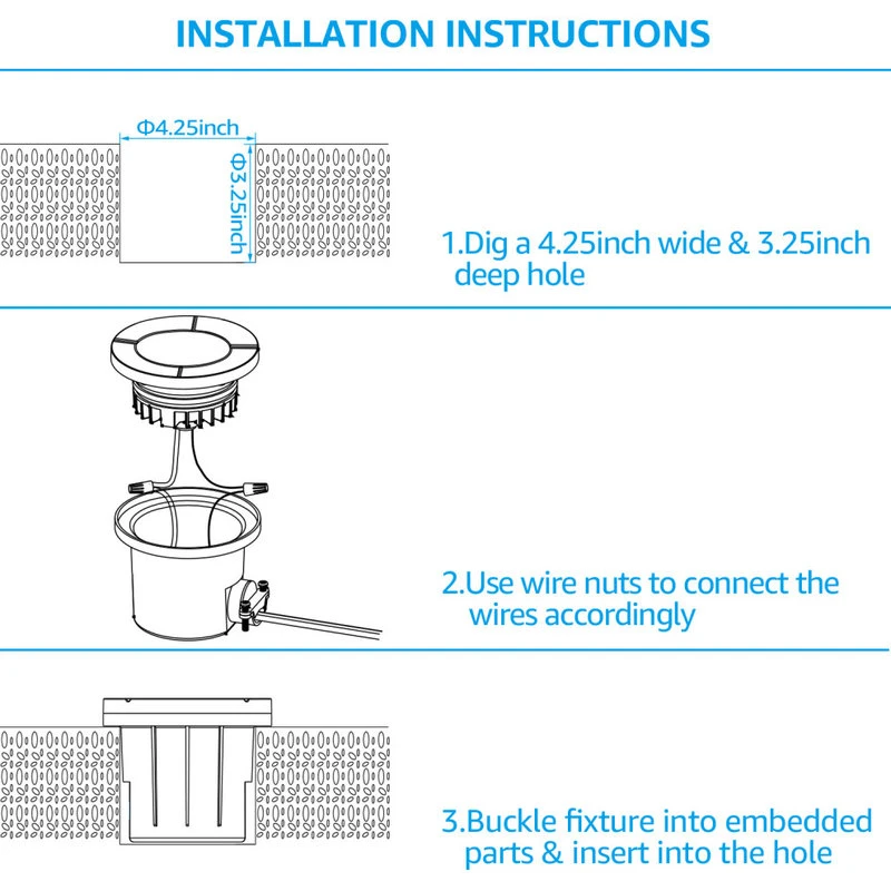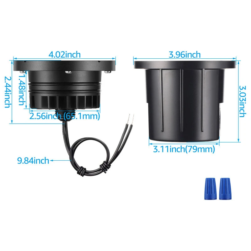 Embedded parts and an anti-slip ring are included. The included accessories make installing this light very easy. Each light comes with 2pcs of blue waterproof wire nuts.