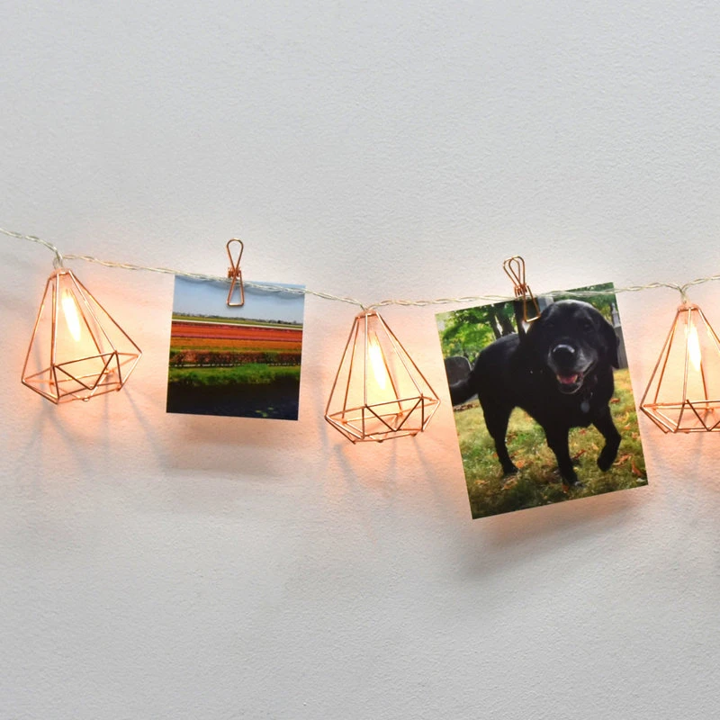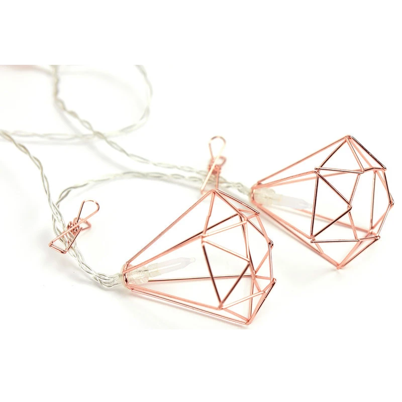 Illuminate your walls and memories using this Rose Gold Diamond String Lights. The clips allow you to hang meaningful tokens that inspire you, while the lights’ geometric wire frames add a modern touch. Rose Gold Diamond String Lights with Clips String Lights contains 1 piece that measures 60 x 0.25 inches. This product measures 5-ft in length when assembled. String lights with geometric design and a rose gold finish; Includes ten clips and ten lights; Warm toned bulbs; Requires 3 AA batteries; Batteries not included; String lights measure 5 feet.