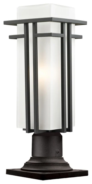 The geometric lines of the Abbey family combine well with contemporary home styling as well as homes in the craftsmen style. This medium outdoor pier mount fixture is made of steel and finished in Dark Outdoor Rubbed Bronze with matte opal glass