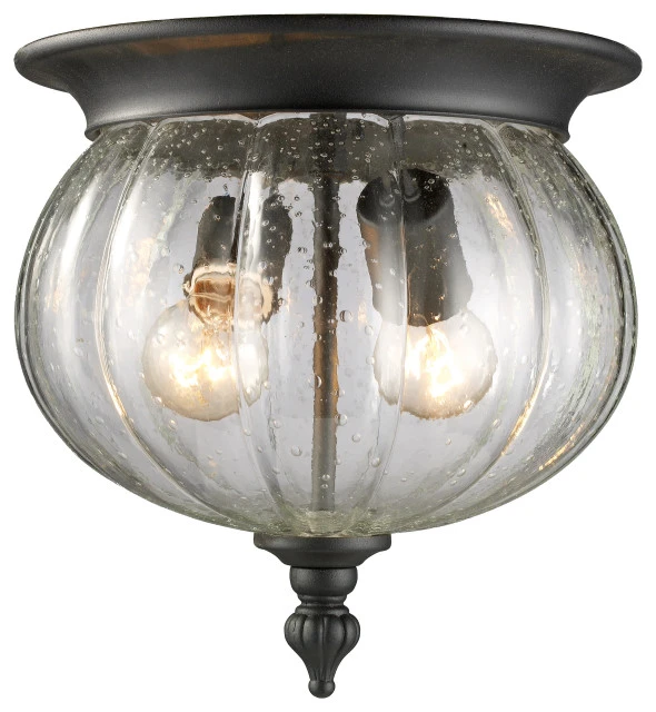 - This cast aluminum outdoor flush mount uses reed seedy clear glass to create a unique look, along with the black finish and decorative finial.